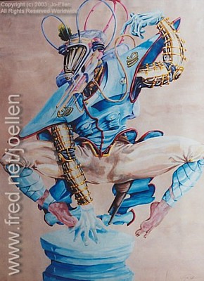 (as he leaps) upon a pedestal. He has a green feather in